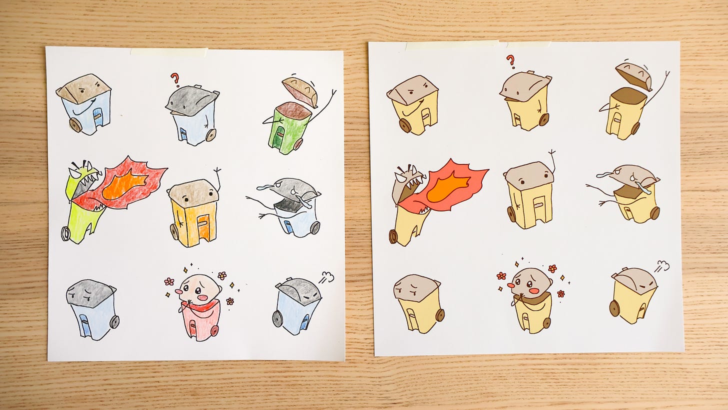 Iām really happy with the drawings. I like how I played with the shape of the character to match the expression, like the trash can in the upper-left corner is more angular; the pink one is rounded, etc.