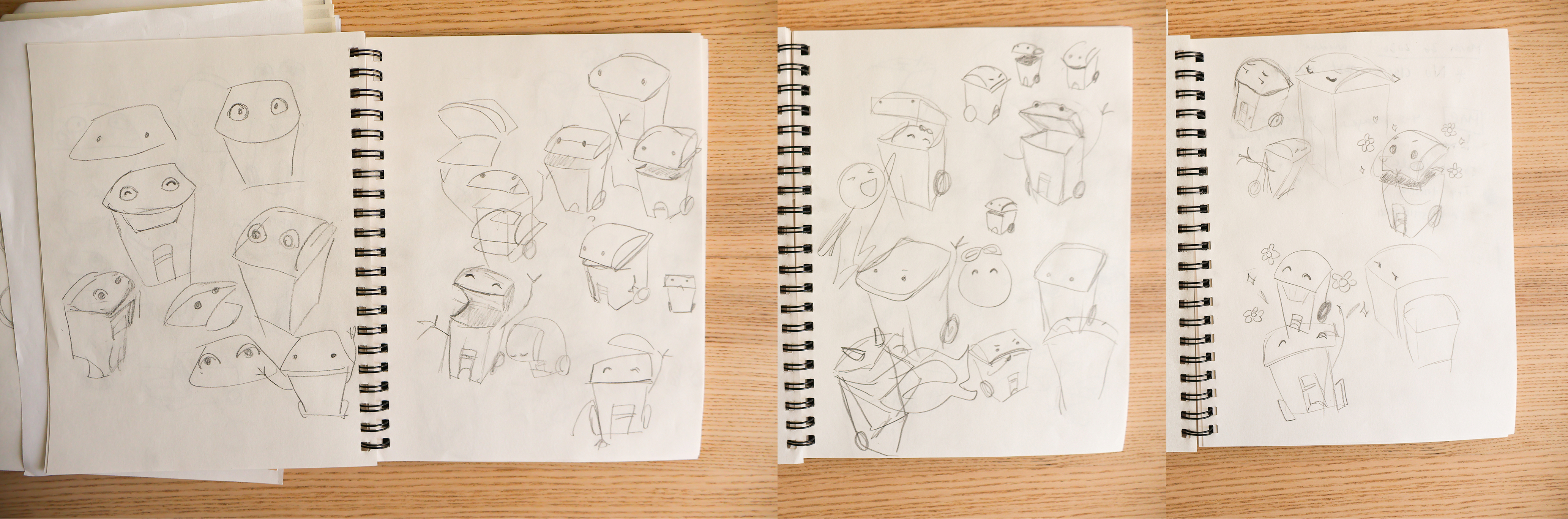 I started designing a trash can character. My first attempts were Muppet-y, but Muppets can get scary-looking quickly lol, so I simplified.