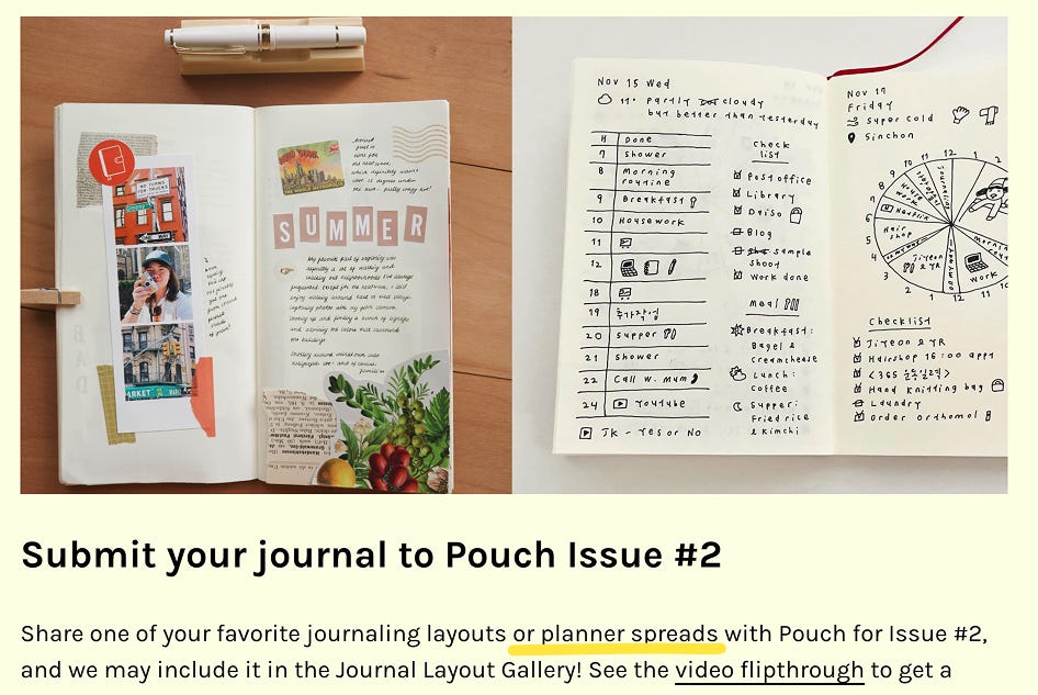 In Pouch Issue 1 & 2, I called the layout gallery the âJournal Layout Gallery,â but I didnât intend to omit planners. I thought the word âjournalâ captured both âplannersâ and âjournals,â and I had attempted to welcome planners in the fine print: